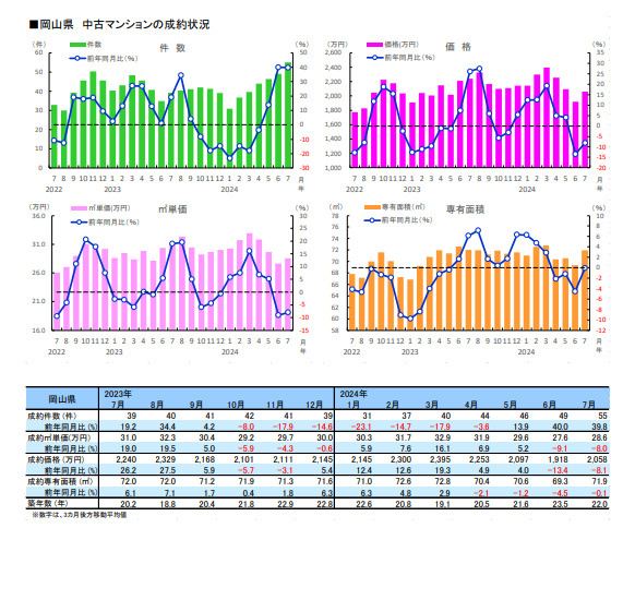 岡山市内の中古マンション市場ですが、取引件数は多少増加しましたが、成約価格や専有面積については、先月と比べ上昇しております。ですが、前年比と比較すると成約価格や専有面積については下回っているのが見受けられます。このように年々、取引件数や成約価格が変動しており、変化が大きいのが見受けられます。