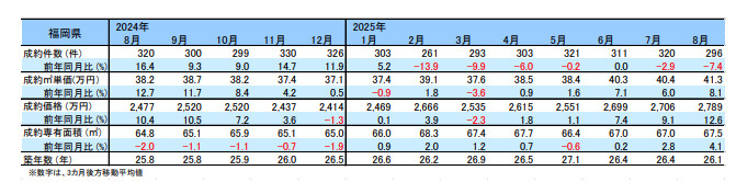 成約件数は 150 件で前年比マイナス 5.5%と、24 年 1 月以来 19 ヶ月ぶりに減少した。平均成約価格は 2,337 万円で前年比プラス 9.7%と、5 ヶ月連続で上昇した。土地面積は 221.9 ㎡で前年比マイナス 3.3% と、7 ヶ月連続で縮小した。建物面積は 114.9 ㎡で前年比マイナス 0.3%と、ほぼ横ばいながら 9 ヶ月連 続で縮小した。