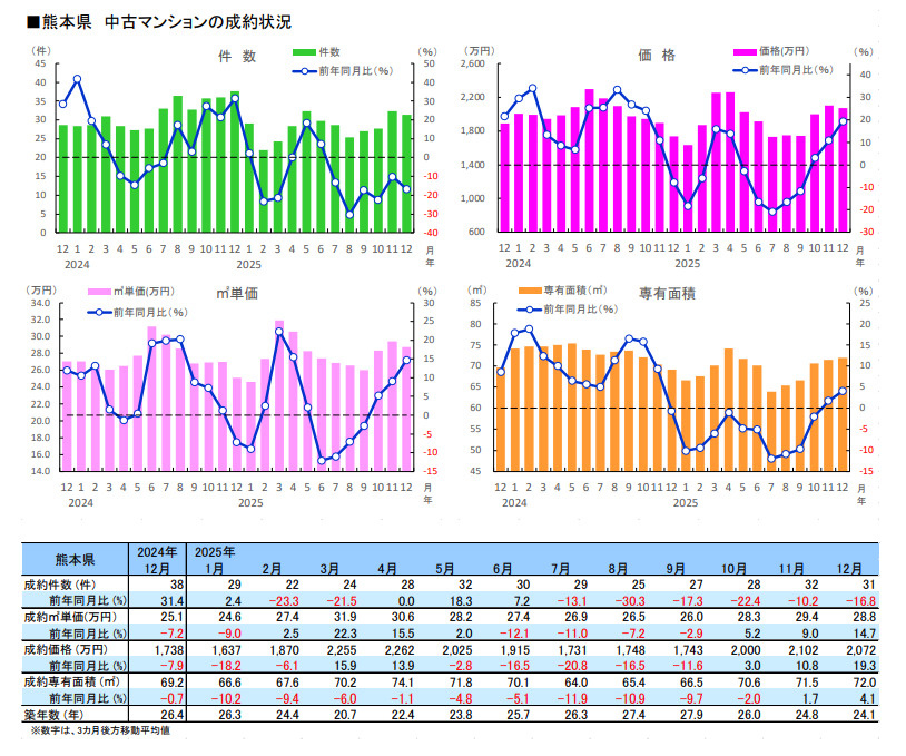 成約件数は31件で前年比マイナス16.8%と6ヶ月連続で減少しました。平均成約㎡単価は28.8万円で前年比プラス14.7%、成約価格は2,072万円で前年比プラス19.3%と、双方とも3ヶ月連続で上昇しました。専有面積は72.0㎡で前年比プラス4.1%と、2ヶ月連続で拡大しました。