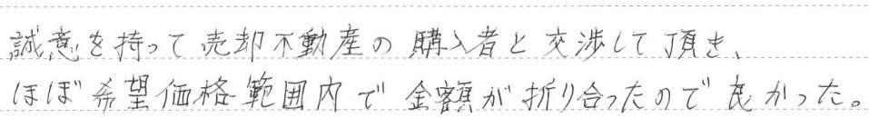 誠意を持って売却不動産の購入者と交渉して頂き、ほぼ希望価格範囲内で金額が折り合ったので良かった。