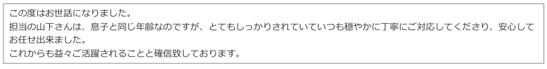 担当の山下さんは、息子と同じ年齢なのですが、とてもしっかりされていていつも穏やかに丁寧にご対応してくださり、安心してお任せ出来ました。