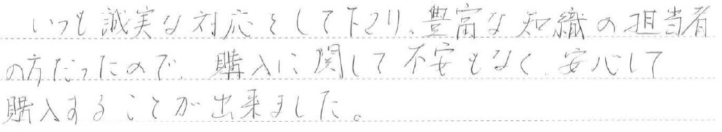 いつも誠実な対応をして下さり、豊富な知識の担当者の方だったので、購入に関して不安もなく、安心して購入することが出来ました。