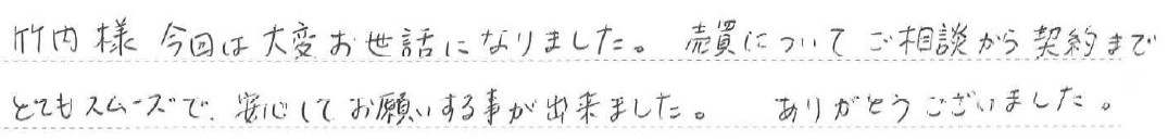 竹内様 今回は大変お世話になりました。売買についてご相談から契約までとてもスムーズで、安心してお願いする事が出来ました。ありがとうございました。