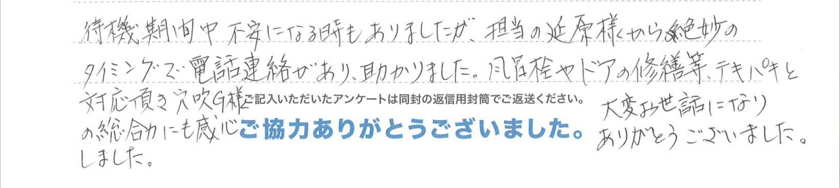 風呂栓やドアの修繕等、テキパキと対応していただき穴吹G様の総合力にも感心しました。