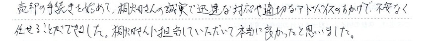 売却の手続きを始めて、桐畑さんの誠実で迅速な対応や適切なアドバイスのおかげで、